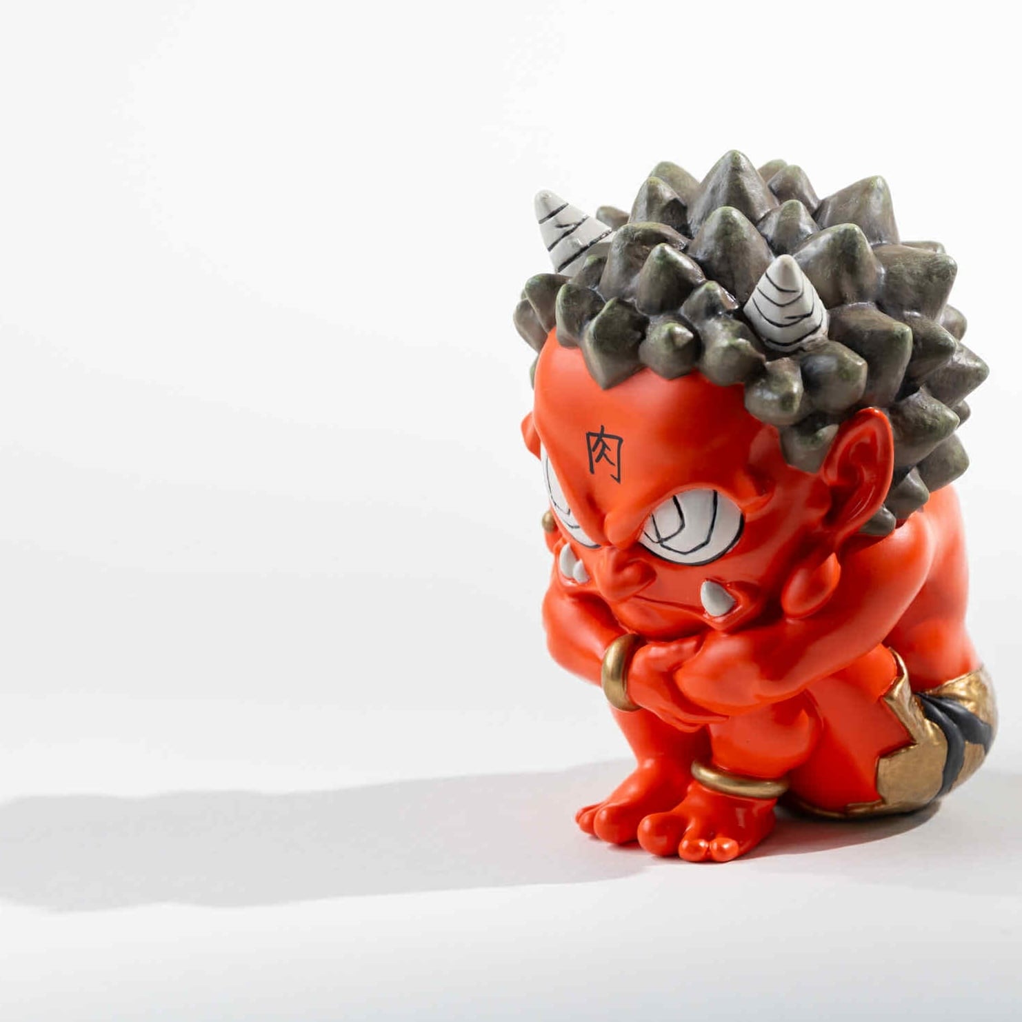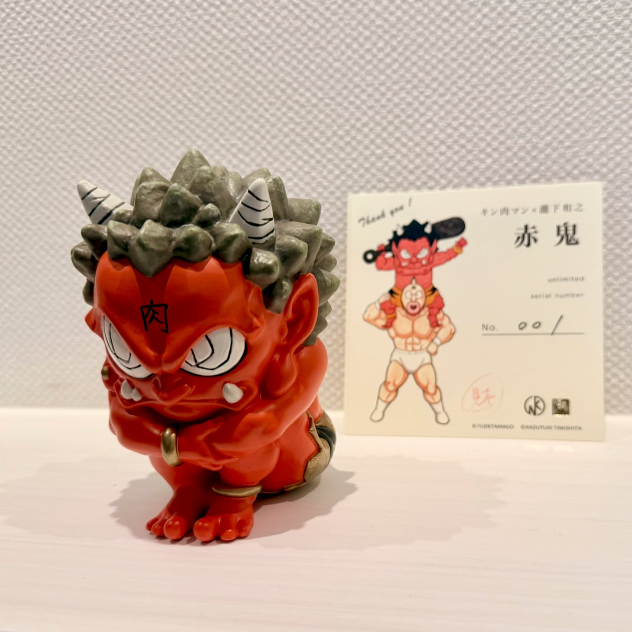伝統と現代ポップカルチャーの融合 日本の伝統的な鬼のモチーフに、国民的人気を誇る「キン肉マン」のアイコンを融合させた、他に類を見ない独創的なデザイン。力強い赤鬼の額には、キン肉マンの象徴である「肉」の文字が誇らしげに刻まれています。